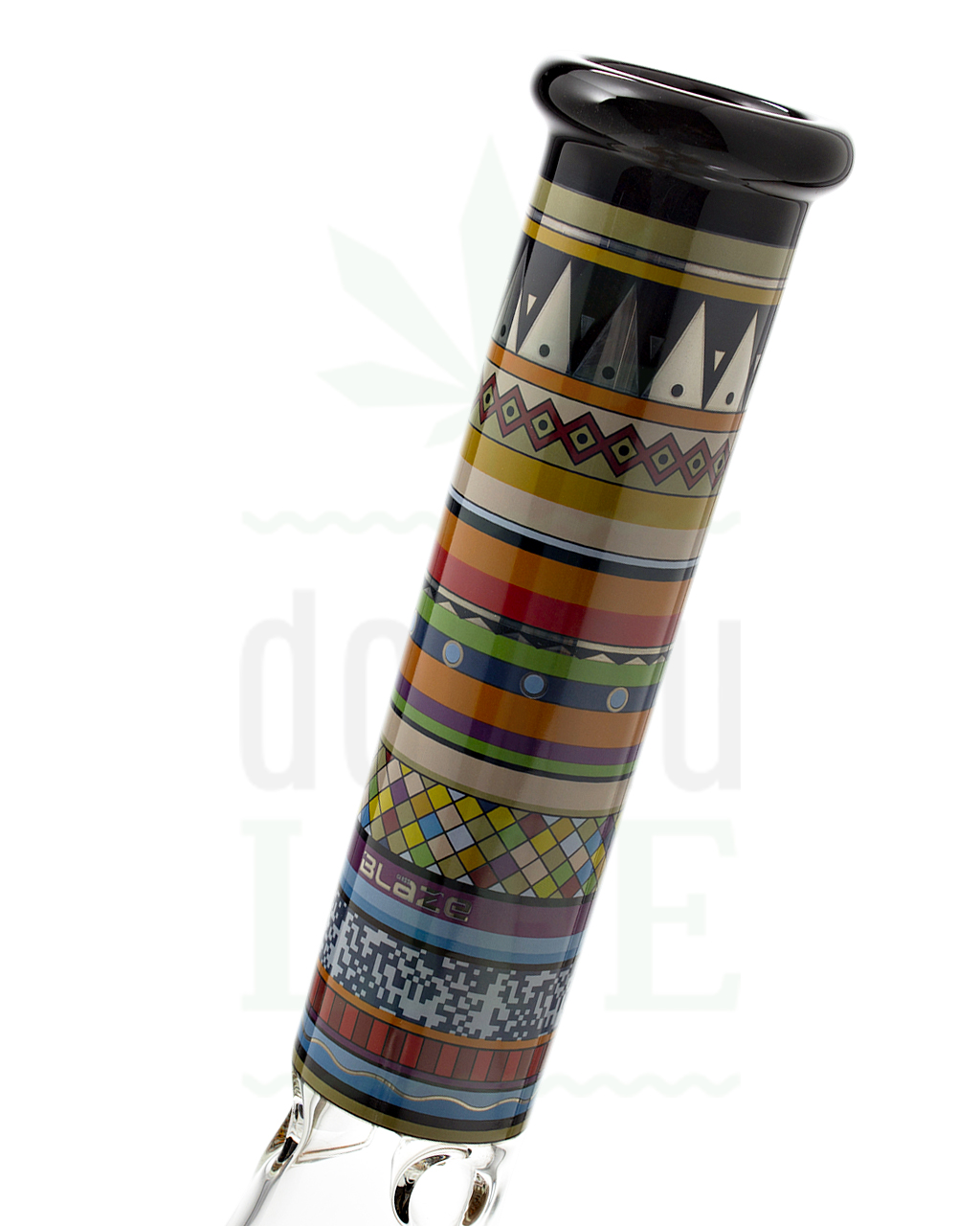 Diese wunderschöne, handgemachte Kolbenbong Totem unserer Premiummarke BLAZE GLASS verzaubert durch den strahlend-bunten Print auf edlem, schwarzen Borosilikatglas.