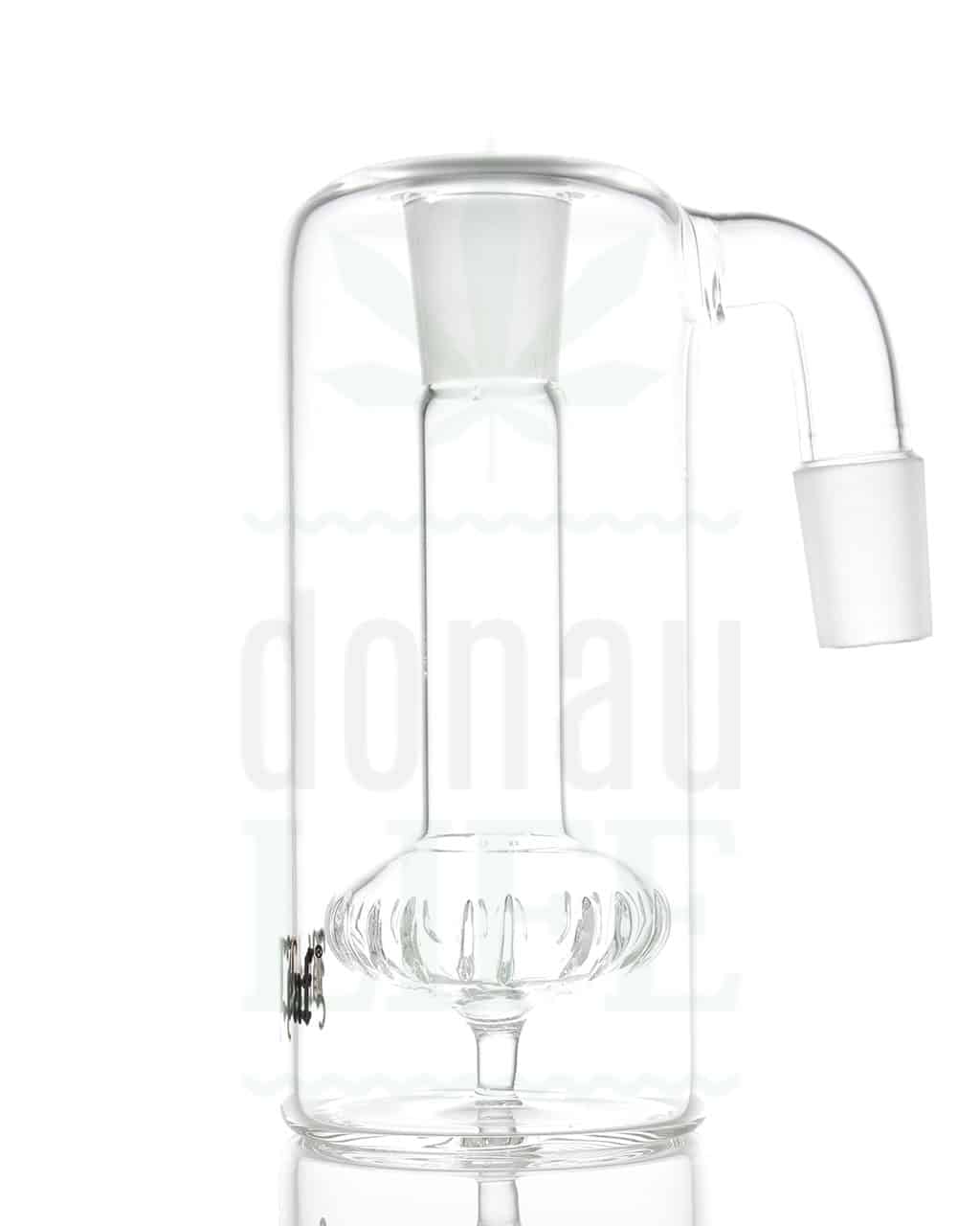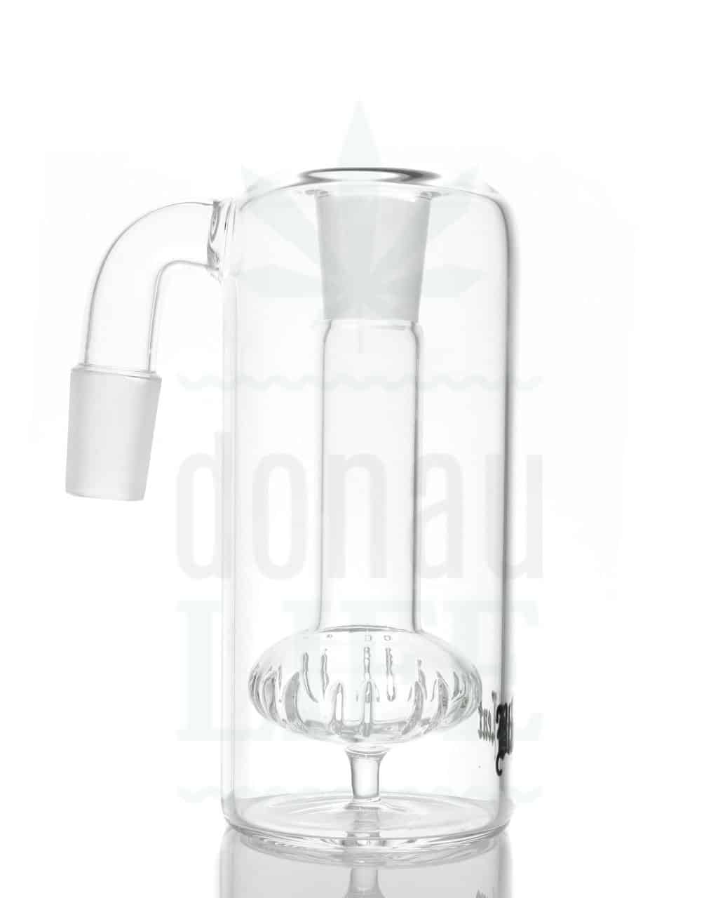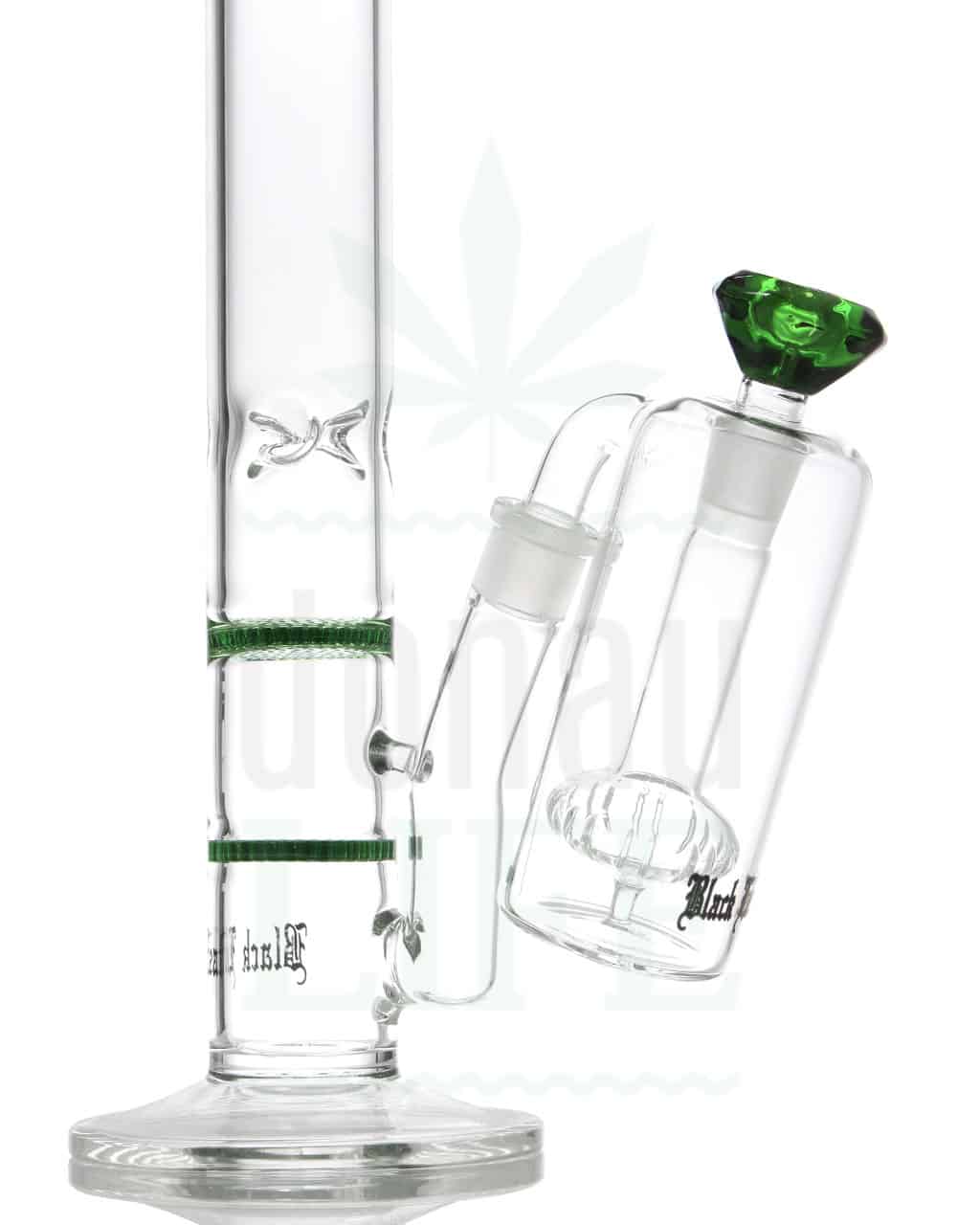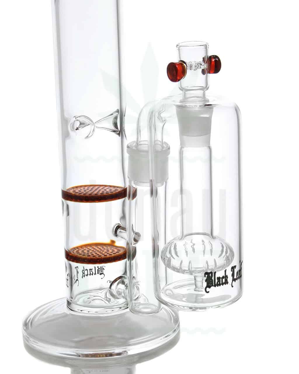Vorkühler und Aschefänger von ‘Black Leaf’ mit einem Duschkopf-Perkolator. Dieser “Dampf-Reiniger” sorgt nicht nur für intensive Abkühlung durch die große Dampfverwirbelung, sondern filtert gleichzeitig unerwünschte Schadstoffe raus. Das Ergebnis: Aromatischer, milder Bong-Genuss ohne Kratzen im Hals. Der Vorkühler hat zwei 14,5 mm Schliffe und einen 90° Schliffansatz.