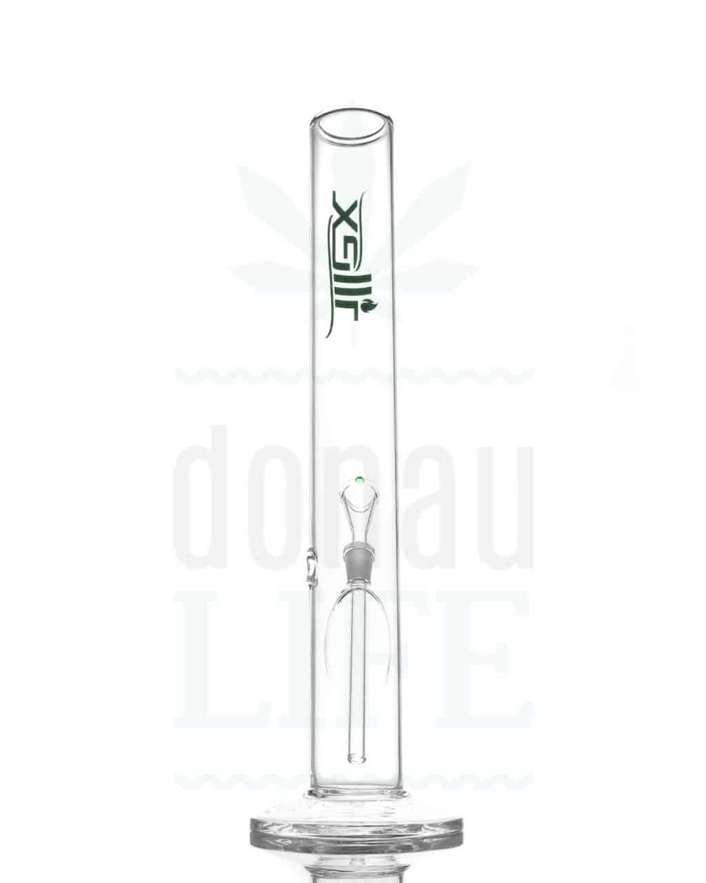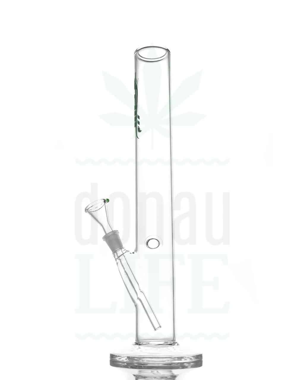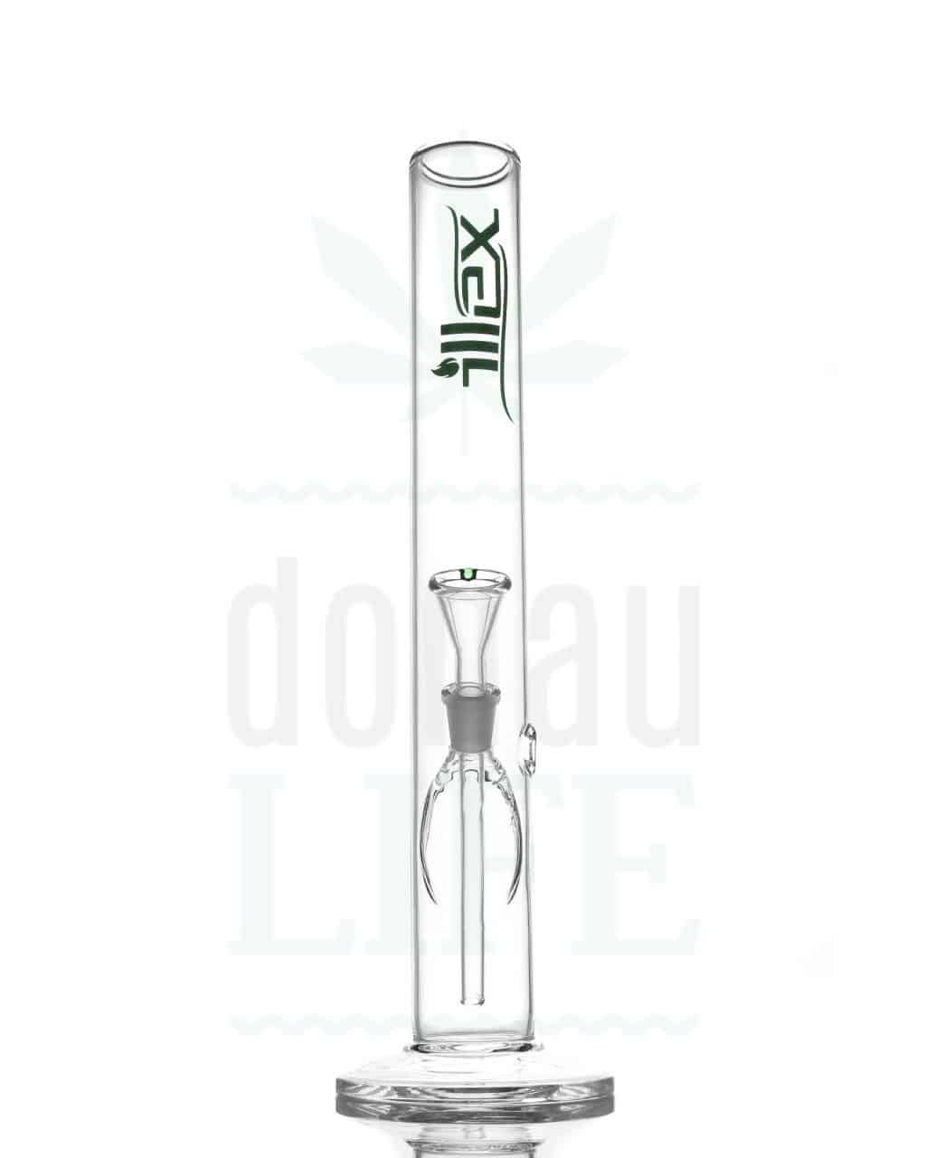The Tube’ ist eine simple aber effektive Glasbong mit seitlichem Kickloch. Sie kommt mit einem 14,5 mm Schliff und einer Höhe von 40 cm. Auf der Vorderseite ist sie mit dem Illex Logo in schwarz bedruckt. Mit ihrem Rundfuß steht sie stabil auf jedem festen Untergrund.