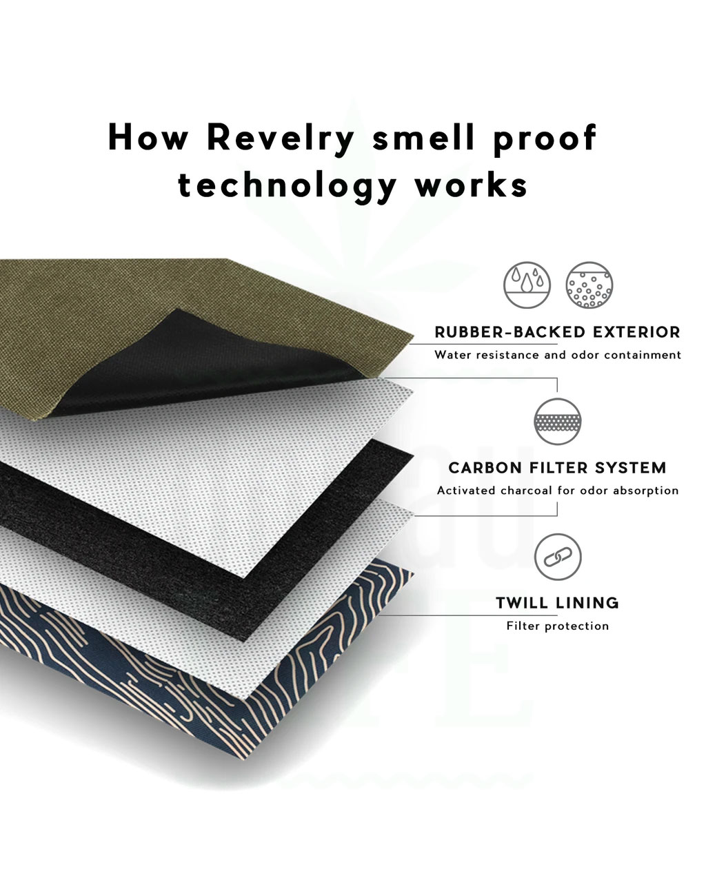 Die Taschen von Revelry verfügen über eine Außenschicht aus Nylon oder Baumwolle, verstärkt mit Gummi für intensive Nutzung. Die Gummiverstärkung, die von außen nicht sichtbar ist, dient außerdem als erste Schicht gegen das Austreten von Gerüchen und das Eintreten von Wasser.