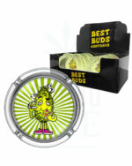 Tämä tuhkakuppi esittää vihaiseksi tekeytyvää “Budia”, joka kantaa kahta AK47-kivääriä ammuksineen. Suussa on valtava savuava sikari, ja taustalla näet Amnesia Haze ja Jack Herer -lajikkeille omistettuja hautakiviä.