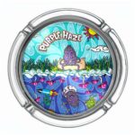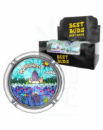 Best Buds Purple Haze -tuhkakuppi esittää erilaisia sieni- ja nuppuhahmoja sumuisessa taustassa hengailemassa.