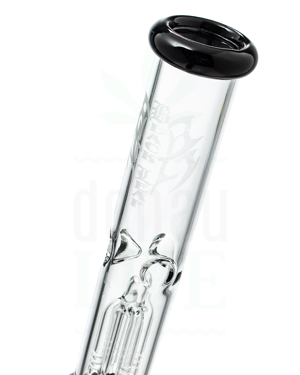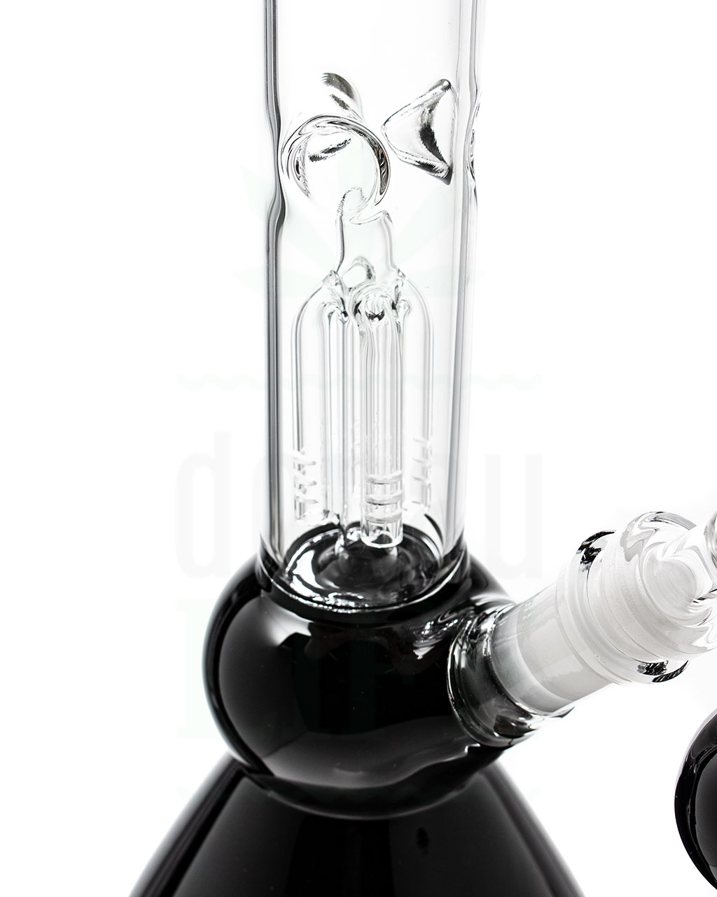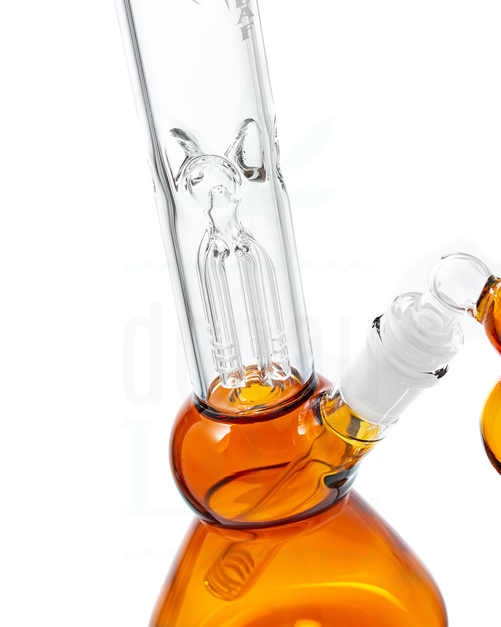 Die ‘Butterfly’ von Black Leaf ist unter Bongliebhabern mittlerweile der Klassiker schlechthin. Diese kompakte Glasbong besitzt ein ganz besonderes Gimmick, und zwar hat sie einen Ashcatcher der gleichzeitig auch als Köpfchen dient. Dieser filtert schon im ersten Schritt den gröbsten Teil der Schadstoffe aus dem Rauch. Danach bewegt sich der Rauch durch das Chillum in den Bauch, wo er durch den Diffusor weiter verwirbelt wird. Wenn er dann in der Bong aufsteigt muss er den Baumperkolator passieren der nicht nur Schadstoffe abfängt sondern auch als Splashguard dient.