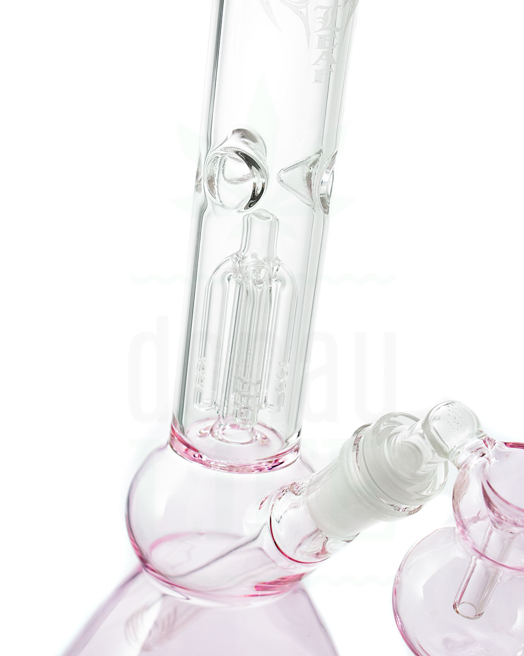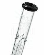 Die ICE Dornen trennen die Eiskammer ab, wo der Rauch zusätzlich gekühlt wird und dann über das Ringförmige mit farblichen Akzent bestückte Mundstück inhaliert wird. Der Schliff der Bong beträgt 18,8 mm wohingegen das Chillum gleichzeit als Adapter auf 14,5 mm dient. Somit wirden mit dem inkludierten Chillum ein Köpfchen mit einem NS14 benötigt. Auf der Vorderseite ziert das Logo der Marke ‘Butterfly’ in sandgestrahlter Optik.