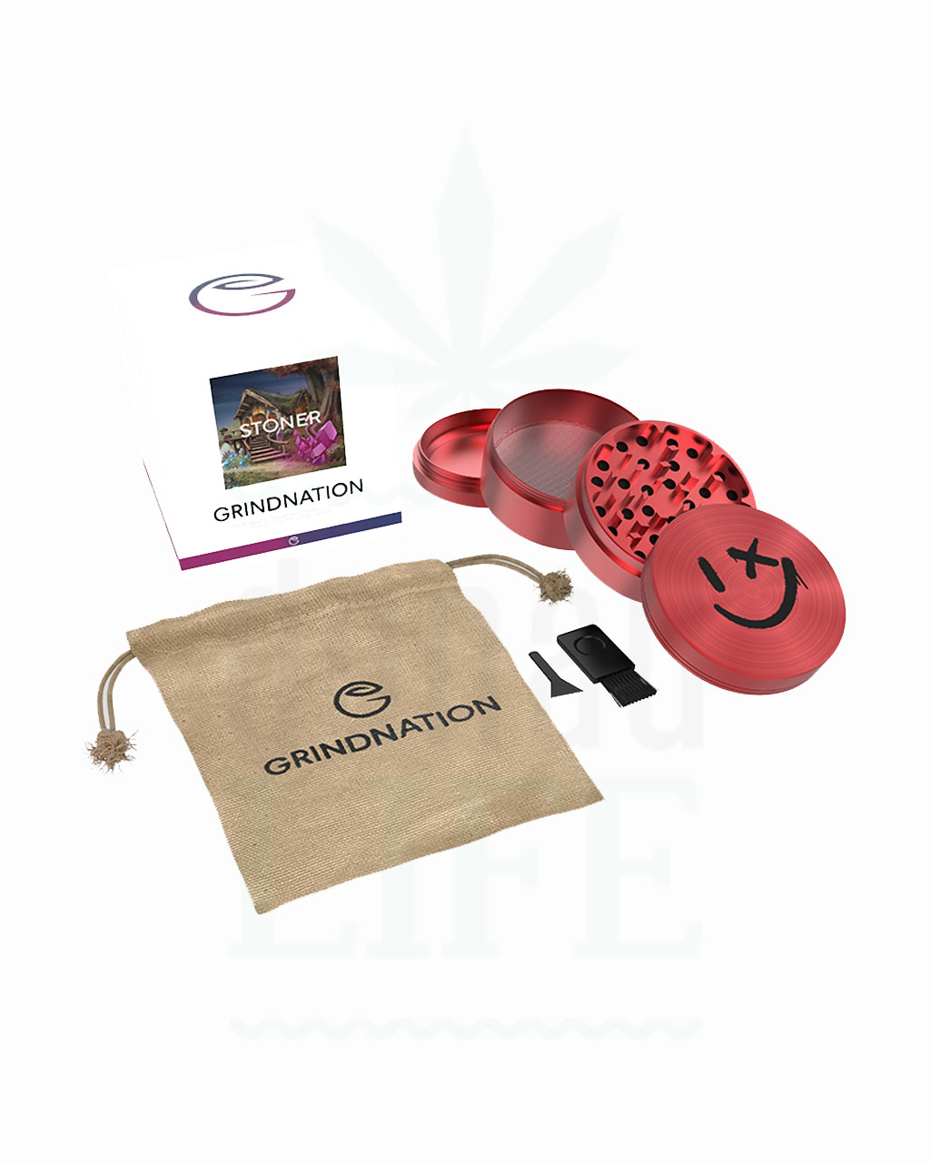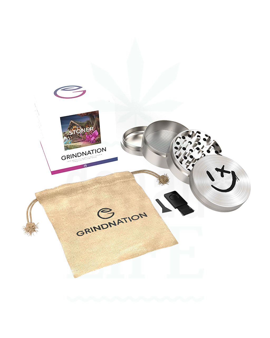 Set – bestehend aus Grinder, Hanf-Aufbewahrungsbeutel, Pinsel und Pollenschaber