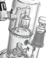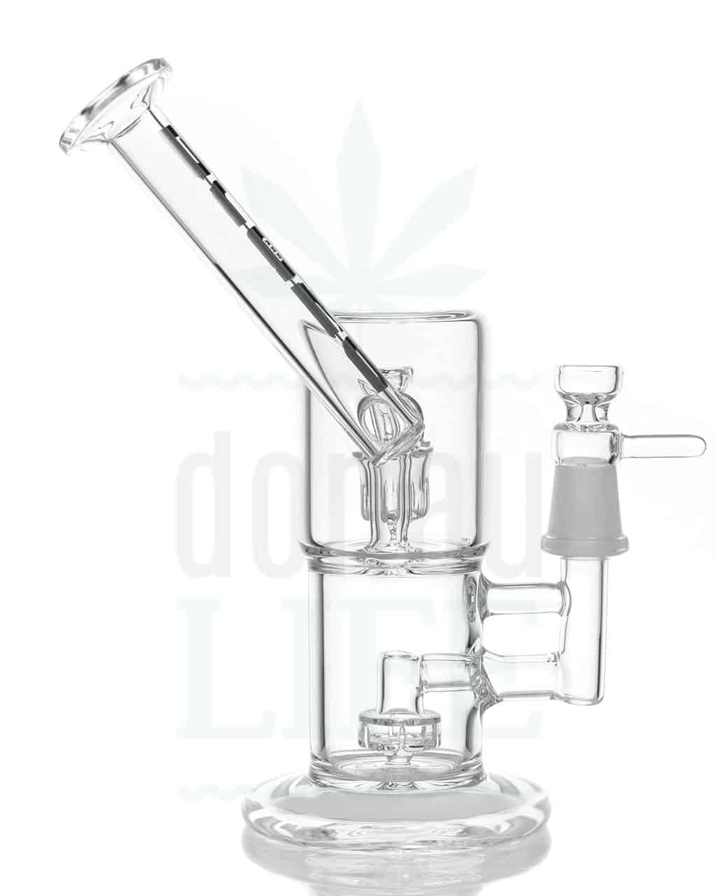 Danach passiert der Rauch einen Trommelperkolator, anschließend zieht er durch einen Spritzschutz mit Diffusorschlitzen. Zu guter Letzt steigt der Rauch durch eine Rauchweg-Verengung in die letzte Kammer auf, bevor er endlich – gekühlt, gefiltert, gemildert aber gehaltvoll – genossen wird.Wer einen noch kühleren und sanfteren ‚Blaze‘ bevorzugt, kann auf die Rauchweg-Verengung crushed Eis einfüllen.