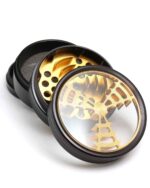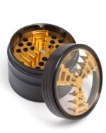 Die schwarze Kräutermühle ‘Mill’ aus Aluminium mit Sichtfenster hat ein goldenfarbenes Mahlwerk im Design von Windmühlenflügeln mit Rotorklingen zum Zerkleinern. Die Kanten in der Bodenkammer sind abgerundet, so dass das fein gemahlene Material mit dem Schaber, der an ein Plektron erinnert, fast rückstandsfrei entleert werden kann. Der Grinder hat einen magnetisch schließenden Deckel, Nylon-Gleitring und ein integriertes Sieb.
