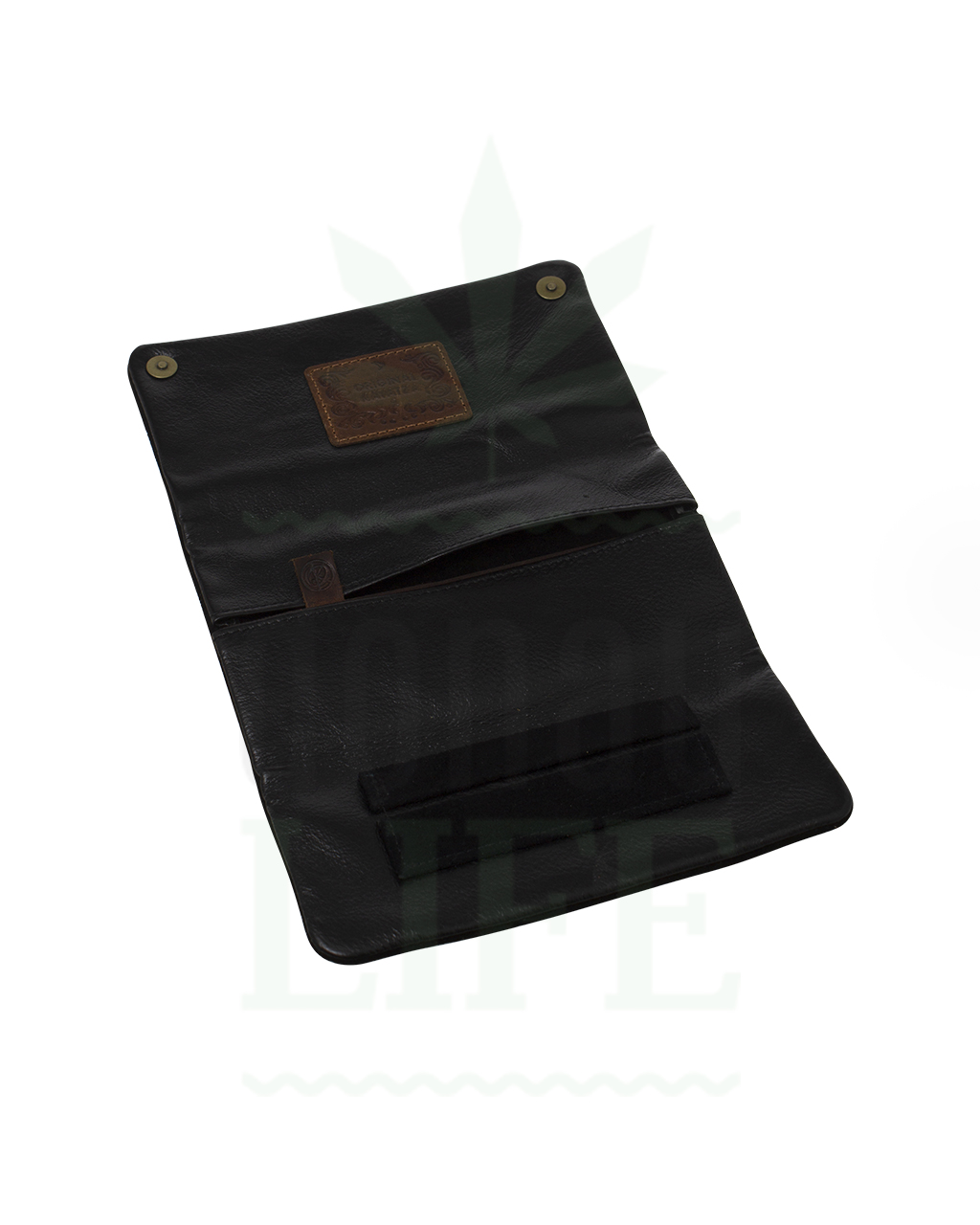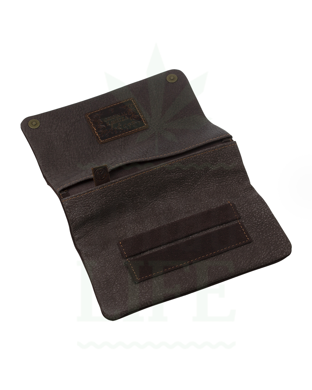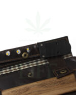 Original Kavatza ‘Cannaboy’ Drehtasche aus Leder mit Gürtelapplikation und eingestanztem Hanfblatt. Einzigartig und wahrhaftig. Sie hat zwei Innentaschen, die hintere für den Tabak und die vordere für Filter und Feuerzeug. Die Blättchenhalter sind selbstverständlich auch angebracht.