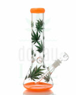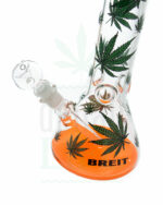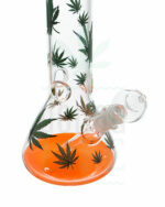 Die handgefertigte Icebong in Kolbenform von ‘BREIT‘ ist mit zahlreichen grünen Leafs bedruckt, während die Knallfarbe des Mundstücks und des Bodens einen interessanten Kontrast dazu bilden. Die Bong hat Eisdornen, ein Diffusoradapter-Stecksystem und einen Kräuterkopf.