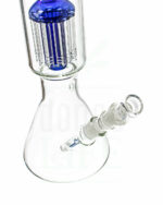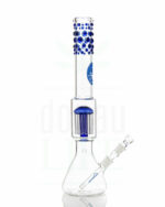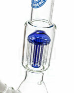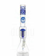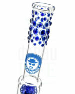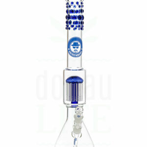 En beakerbong av vanligt Heisenberg-kvalitet! ;) Det finns små pärlor inbäddade vid bonghalsen, vilket gör att det ser ut som om vattendroppar rinner ner. Detta fina stycke är nästan 50 cm högt och är utrustat med ett 18 mm huvud. Rören är cirka 12 cm långa. Diameter är 50 mm vid munstycket. Väggens tjocklek är 5 mm. Halsen pryds av Heisenberg-logotypen i blått. Det stora rökröret skjuter snabbt upp och knockar snabbt oerfarna rökare. Du kan dra hårdare i bongen, eftersom både slitsdiffusorn och 12 armarna percolatorn ger en bra dragning, även utan risken att överflödigt vatten sprutar upp till munnen.