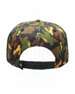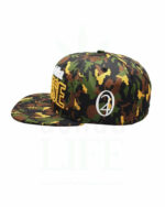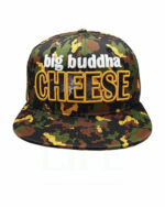 Lauren Rose hat diese Big Buddha Cheese Snapback in Gelb/Grün/Braun mit Camo-Muster entworfen. Das Logo auf der Vorderseite ist in 3D gestickt, innerhalb der Cheese-Buchstaben ist ein Rauchmuster zu sehen.